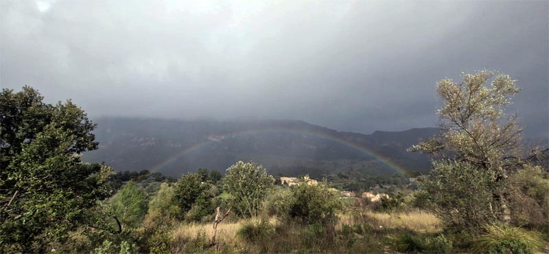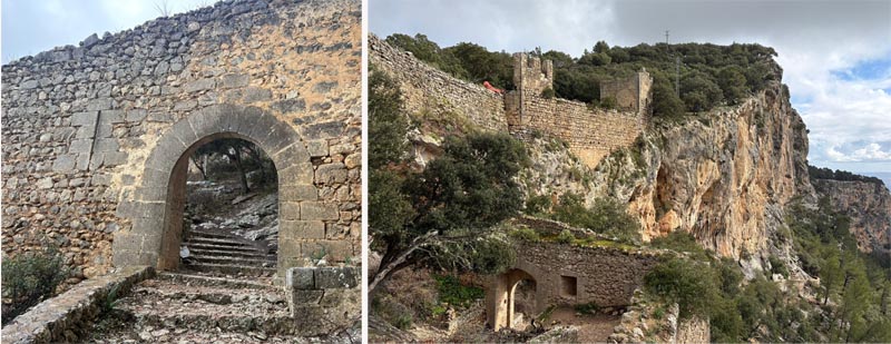 El camí ens portarà novament a una barrera que porta a la carretera d’Orient a Alaró, passam l’Hermitage, amb pluja que ens fa obrir els paraigües, fins arribar al camí que ens ha de portar al castell d’Alaró (822m), que pujarà progressivament, primer des d’un clar d’oliveres i després ja dins la densitat del bosc, el camí es fa una mica més feixug i el grup es dispersa. A poc a poc, i alerta a patinar, arribam fins al coll des Pouet (5,6 km), on el grup es torna a concentrar amb un parell de baixes que arribaran fins as Verger. Els altres prendran el camí que puja per la dreta fins al castell així com ho indica el pal del GR. Mentre ens creuem visitants que ja davallen, podem travessar el camí escalonat i empedrat seguit per la màniga d’aigua i que ens porta arran de les vistes que aquesta vegada es veuran tapades per la boirina i el mal temps. Les runes del castell ens esperen amb la marca del cavall del rei en Jaume al seu portal.