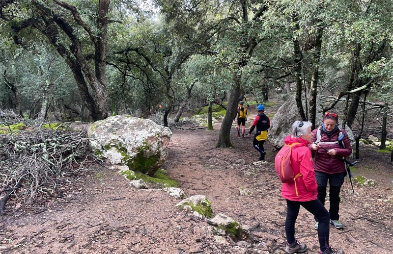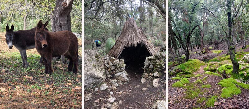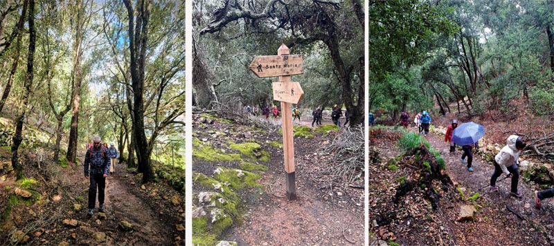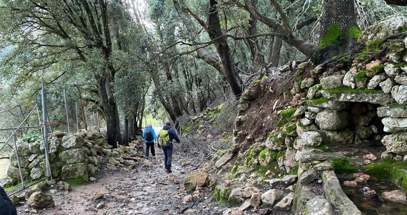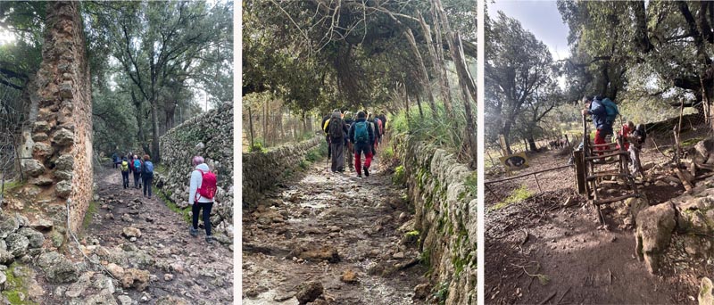Una vegada que el grup s’uní, reprenguérem el camí entre velles alzines per anar pujant a poc a poc, mentre estàvem molt pendents de la pluja que semblava amenaçar-nos. Adesiara som testimonis de l’antiga activitat carbonera dels llocs més tradicionals de les tasques que es feien a dins del bosc, com puguin ser els rotlles de sitja (en castellà, “silos”). El camí del comellar de Sa Comuneta és bo de dur tot i que ja hi comença a haver-hi els primers rosts. De moment, anam xino-xano fins al portalet que separa el coll de la muntanya a 2,4 km del punt de partida, l’anomenat pas de s’Estaló (570 m), que tot i els seus 100 metres de desnivell, no presenta gaire dificultat. El camí ara es fa més estret i ens porta fins al mur que separa els termes de Bunyola i Alaró, ja per un camí més aclarit.