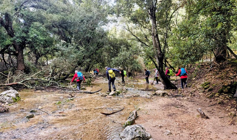 Primerament, l’autocar de 39 places ens deixà a un tram de la carretera d’Orient molt freqüentat pels aficionats a davallar torrents, de fet allà hi havien uns quants grups preparats amb vestits de neoprè i cordes i cascs. El grup pren el camí que davalla cap al Freu, la muntanyeta i l’aigua, amb grans bassiots que intrèpidament superà cada senderista aiixí com uns quants de botadors amb l’ajuda dels guies; passada sa Font de sa Canaleta (0,7 km) el grup es dividí i uns davallaren per una drecera i els altres per un altre costat.