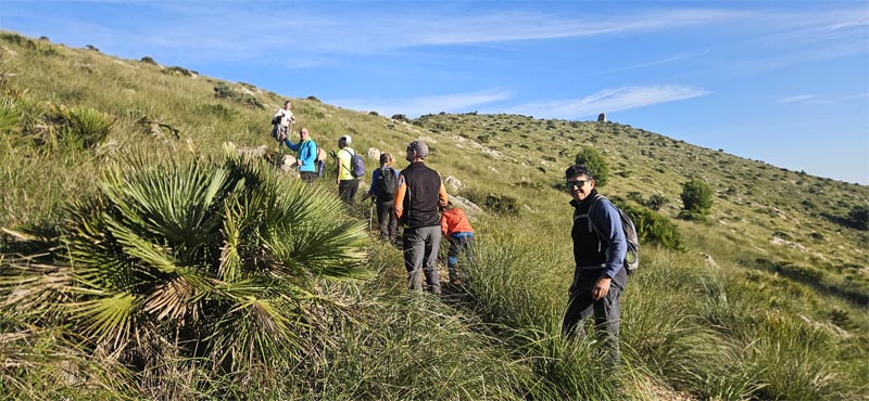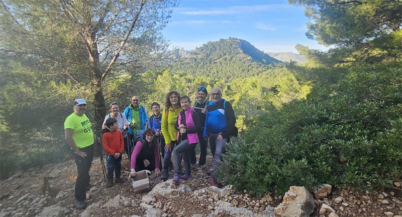 Xino-xano arribàrem al forn de calç, on s’indica la pujada cap a la talaia, un desviament ben senyalitzat. Sense gaire dificultat, pujàrem el primer tram pel bosc, amb una aturada per a reagrupar-nos i fer una fotografia amb el puig de s’Àguila de fons.