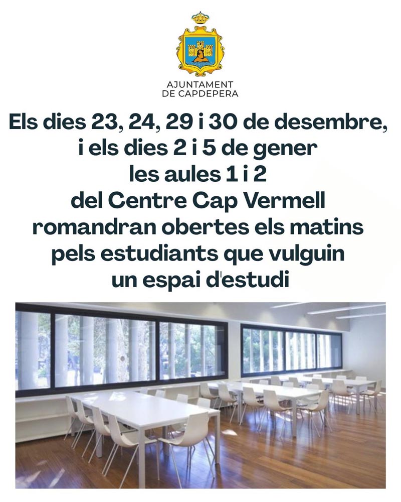 Els dies 23, 24, 29 i 30 de desembre, i els dies 2 i 5 de gener les aules 1 i 2 del Centre Cap Vermell romandran obertes els matins pels estudiants que vulguin un espai d’estudi. Altres articles EOS, creació instrumental de Maria Esther Cantó Liesegang 15 de desembre de 2025 Carta a Cap Vermell: Una protectora d’animals… al mig del poble? 21 de novembre de 2025 El Molinar de Palma, 1936 20 de novembre de 2025 La regidoria de festes publica el programa de l’Esperança i festes de Nadal 2025 6 de desembre de 2025 Judo RENSHINKAN i el festival de Nadal de la Federació 17 de desembre de 2025 Espai d’estudi al Centre Cap Vermell durant les vacances de Nadal 2025 18 de desembre de 2025