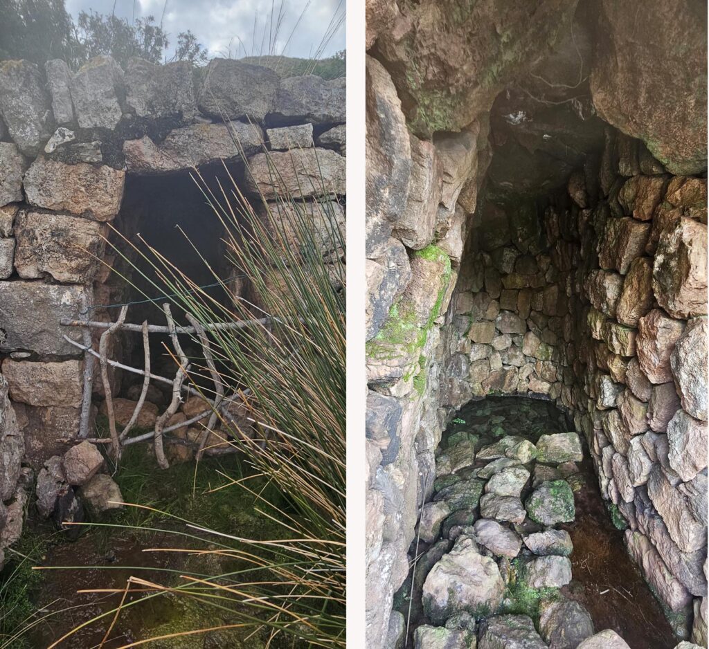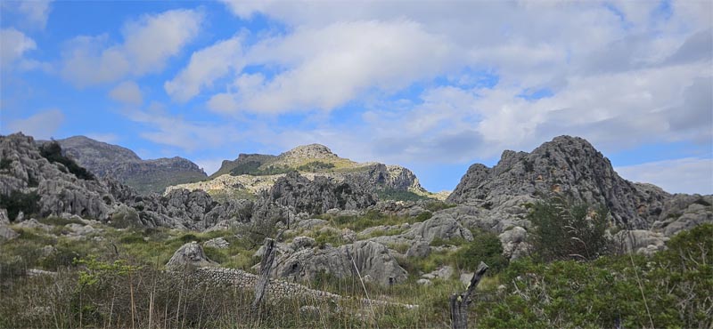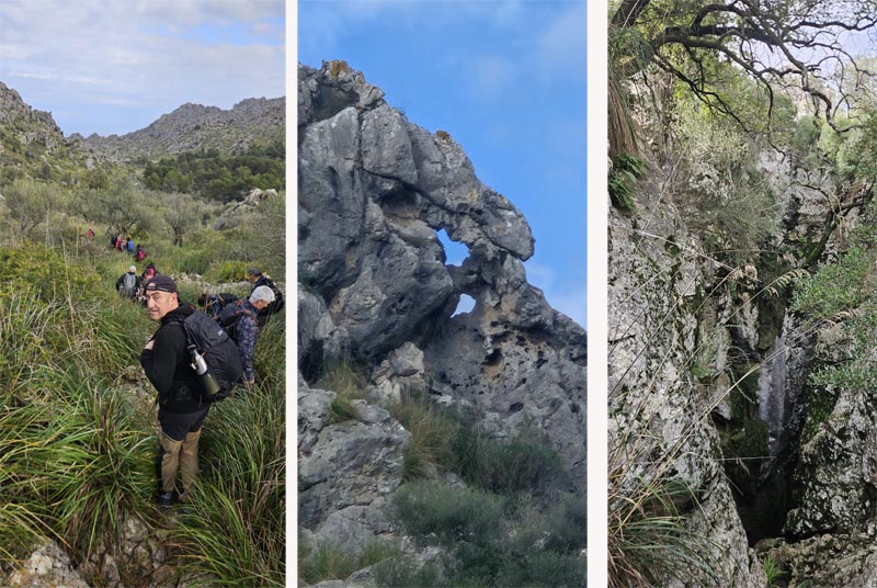 En deixar el bosc el caminoi travessa una zona de carritxeres amb un descens suau. Anàvem amb bones, ja que el terreny estava humit i el pedreny relliscava. Passàrem el cingle de ses Mules de 431 m ( a l’esquerra). Passada una zona planera, Sa Coma, trobàrem un altre sender que es dirigeix cap a La Malé (també serveix per accedir al Rafal d’Ariany fent un volt més llarg) i poc després ens desviàrem una mica de la ruta, a penes uns metres, per veure l’impressionant avenç de s’Aigo.