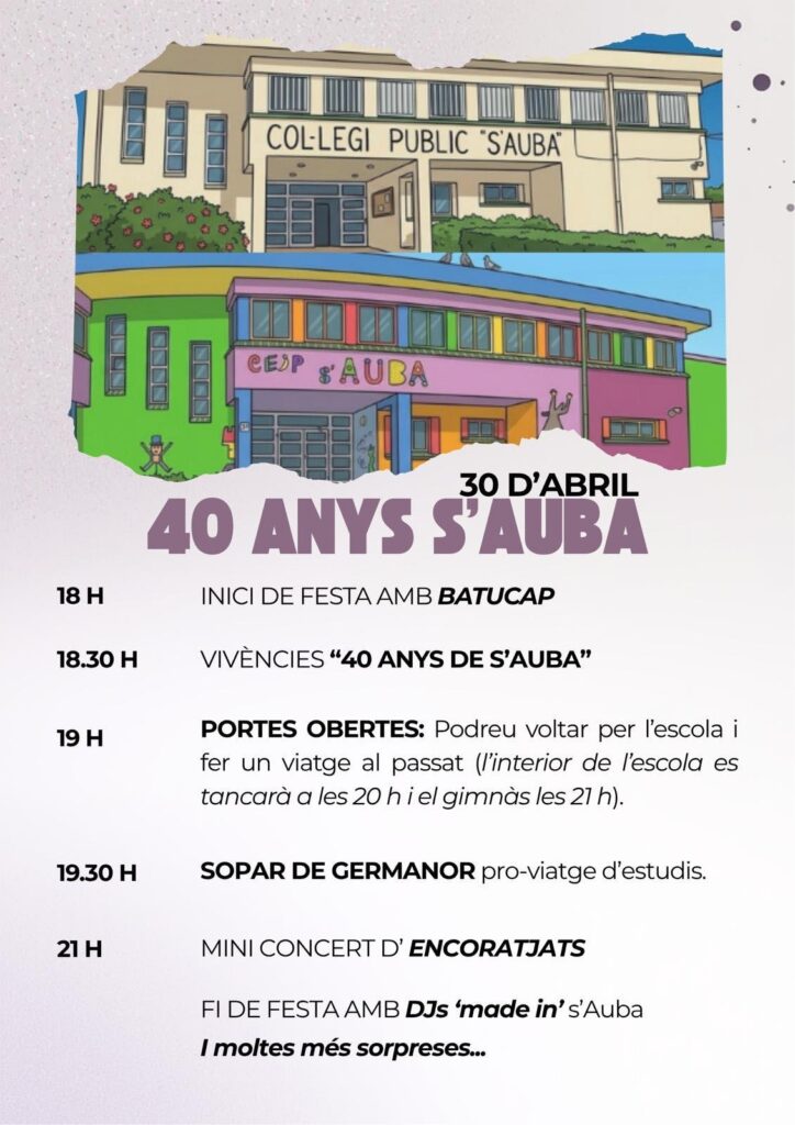 DARRERS DIES per la compra dels TIQUETS del sopar! Del 13 al 17 d’abril de 14 h a 16 h a l’escola. Els tiquets s’han de comprar anticipadament per tenir una previsió del menjar. Pensau a dur els doblers en metàl·lic Altres articles Cròniques de bàsquet 2025-26. Cap de setmana 13, 14 i 15 març de 2026 19 de març de 2026 Judo escolar Renshinkan, brillant a la 15ena edició del Festival de Sant Llorenç. 7 d'abril de 2026 El Servei Municipal d’Esports de l’Ajuntament homeneja a Alexis Gónzalez i Emiliano Martínez 26 de març de 2026 Setmana Santa 2026 /1/ Diumenge de Rams a Capdepera i Cala Rajada 3 d'abril de 2026 Bona actuació de les germanes Lorenzo al campionat d’Espanya sub 20 24 de març de 2026 Fotografia dominical / 195 / Forta tramuntanada per acabar març 2029 29 de març de 2026