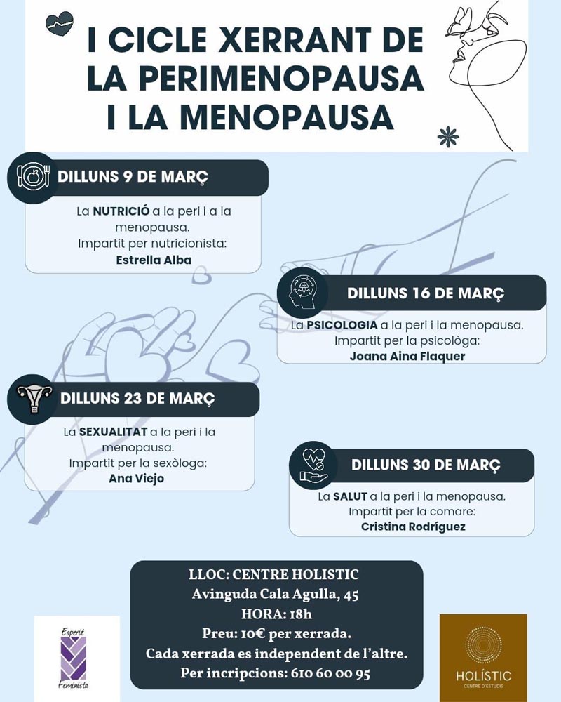 Vos feim saber que l’associació Esperit Feminista ha organitzat un cicle de xerrades al nostre centre, amb el qual ens sentim molt contents de poder col·laborar. Du per títol “I Cicle Xerrant de la Perimenopausa i la Menopausa, i compta amb la presència d’Estrella Alba, nutricionista; Joana Aina Flaquer, psicòloga; Ana Viejo, sexòloga; i Cristina Rodríguez, comare.