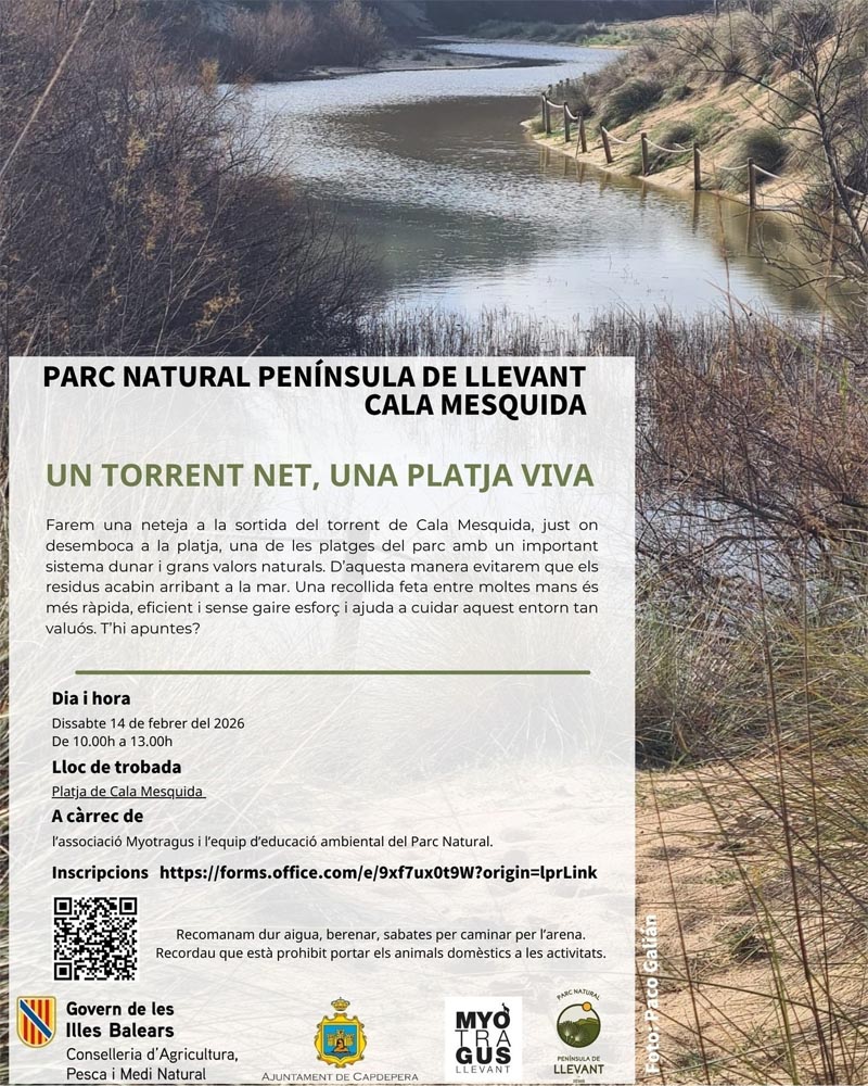 Farem una neteja a la sortida del torrent de Cala Mesquida, just on desemboca a la platja, una de les platges del parc amb un important sistema dunar i grans valors naturals. D’aquesta manera, evitarem que els residus acabin arribant a la mar. Una recollida feta entre moltes mans és més ràpida, eficient i sense gaire esforç i ajuda a cuidar aquest entorn tan valuós. T’hi apuntes?