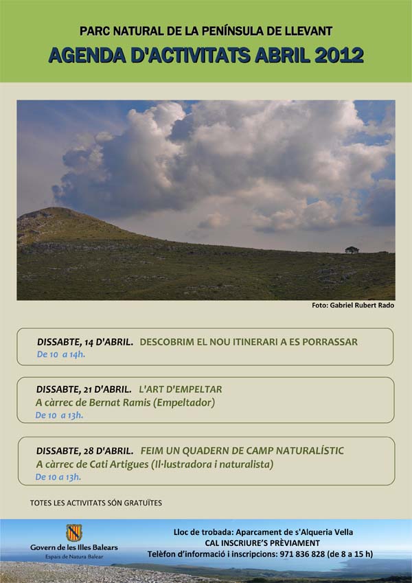 Agenda d’activitats del Parc Natural de la península de Llevant Abril 2012 Altres articles Club de lectura de la Biblioteca de Capdepera: “Dilluns ens voldran” de Najat El Hachmi 19 de març de 2026 Més informació sobre les obres a sa Mesquida d’Abaix que afecten un camí 21 de març de 2026 CE ESCOLAR. Temporada 25-26/ Jornada 22. Crònica d’un empat… amb permís de l’aviació civil 24 de febrer de 2026 8M 2026 a Capdepera/ XII Marxa per la Dona 9 de març de 2026 Diumenge dia 15 de març lliurament del PREMI CAP VERMELL 2025 1 de març de 2026 Tasques de manteniment i reparació a les aules modulars de s’Alzinar 21 de febrer de 2026