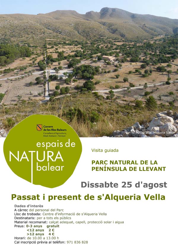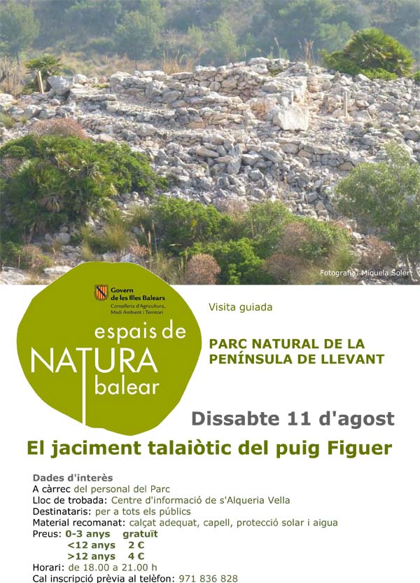 Parc Natural de la Península de Llevant Activitats programades pel mes d’agost 2012 Dia 11 d’agost: El jaciment talaiòtic del Puig Figuer Dia 25 d’agost: Passat i present de s’Alqueria Vella Inscripció prèvia al telèfon 971 836 828 Altres articles L’OCB convoca una cantada multitudinària de La Balanguera a tot Mallorca per commemorar-ne el centenari 13 de març de 2026 L’Arxiu Municipal de Capdepera presenta l’arxiu de Rafel Blanes Tolosa 2 de març de 2026 IAIDO, AIKIDO a l’Acadèmia Renshinkan 4 de març de 2026 II plenari del Consell d’Infància i Adolescència de Capdepera 1 de març de 2026 “Els sis darrers dies” al Teatre de Capdepera 4 de març de 2026 II Concurs de llata “La Palma” 3 de març de 2026