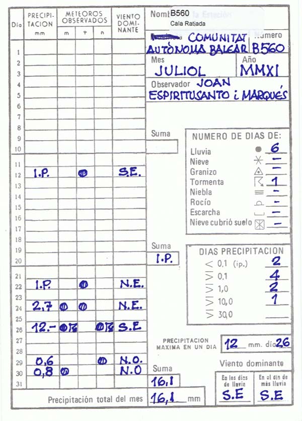 Durant les primeres setmanes vàrem tenir sols un dia de precipitació i en una quantitat inapreciable; el temps més humit se situa del dia 22 al dia 30. El total de dies de pluja, foren sis, la més important correspon al dia 26, amb vent de xaloc de força 3, en què arribaren a caure 12 l/m2.