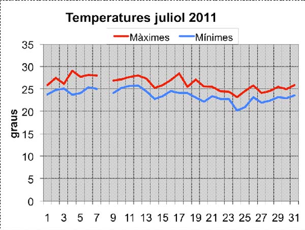 Les temperatures màximes quedaren pràcticament encallades entre els 25 i els 30 graus. Una lleugera davallada a partir del dia 22, i tocant fons el dia 24, amb 23,2 graus, la més baixa dels mes, essent la més alta la de dia 4, en què arribàrem als 29,1 graus.