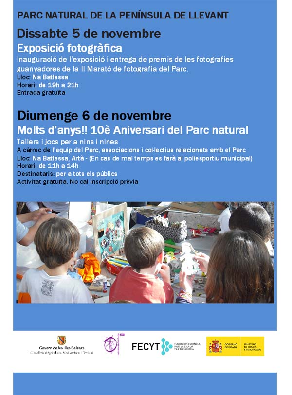 Amb motiu del desè aniversari de la declaració del Parc natural de la península de Llevant, la Conselleria d’Agricultura, Medi Ambient i Territori, a través de l’equip de gestió d’aquest espai natural protegit, ha organitzat per al mes de novembre tota una sèrie d’activitats lúdiques obertes a tots els públics.