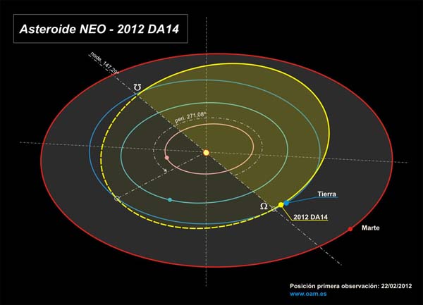 L’asteroide 2012DA14 té una òrbita molt pròxima a la Terra i la creua dues vegades a l’any, a meitat de febrer i a meitat d’agost. El seu període orbital és molt semblant al de la Terra, 366 dies i un quart, o sigui, un dia més que el temps que es torba la Terra en donar la volta al Sol.