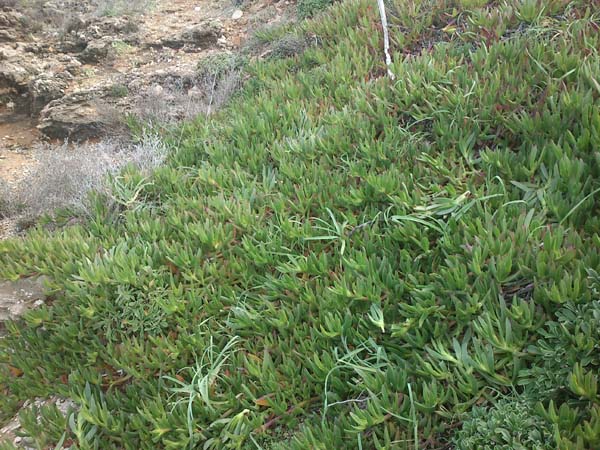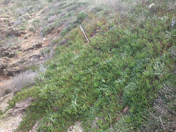 Però no només s’han perdut els cartells, sinò que hi ha una espècie invasora, que segons Costes caldria erradicar i que a es Carregador envaeix amples zones de la costa, sense que les autoritats facin res. Bé, sí que fan: posen cartells (a altres platges) iintentant conscienciar la població que s’ha de lluitar contra les especies invasores com el carpobrotus, però aquí acaba la seva feina…, almanco en es Carregador.