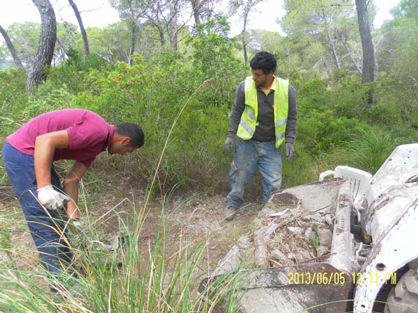 L’empresa concessionària de neteja viària va fer una neteja d’enderrocs al pinar de cala Agulla la setmana passada ( dia 5 de juny 2013). Dos operaris amb maquina petita, un encarregat, una persona que realitza treballs comunitaris i un zelador de l’Ajuntament varen ser els encarregats de retirar els residus que es trobaren a la zona.