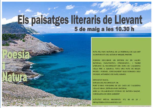 Els paisatges literaris de Llevant Poesia i natura 5 maig a les 10,30 hores A càrrec de Miquel Pastor Altres articles Presentació del l’East Mallorca Cup 2026 31 de març de 2026 8M 2026 a Capdepera/ Taula rodona sobre dones i llata en el segle XX 7 de març de 2026 Els “minis” del Renshinkan triomfen al torneig de Cala Rajada de judo per a l’edat escolar 11 de març de 2026 Sa pella pes mànec – 26 – Bullit d’ossos i altres delicadeses 22 de març de 2026 Fotografia dominical / 193 / Llevantada de març 8 de març de 2026 “Dos mestres, una amistat”. Art i futbol es donen la mà 28 de març de 2026