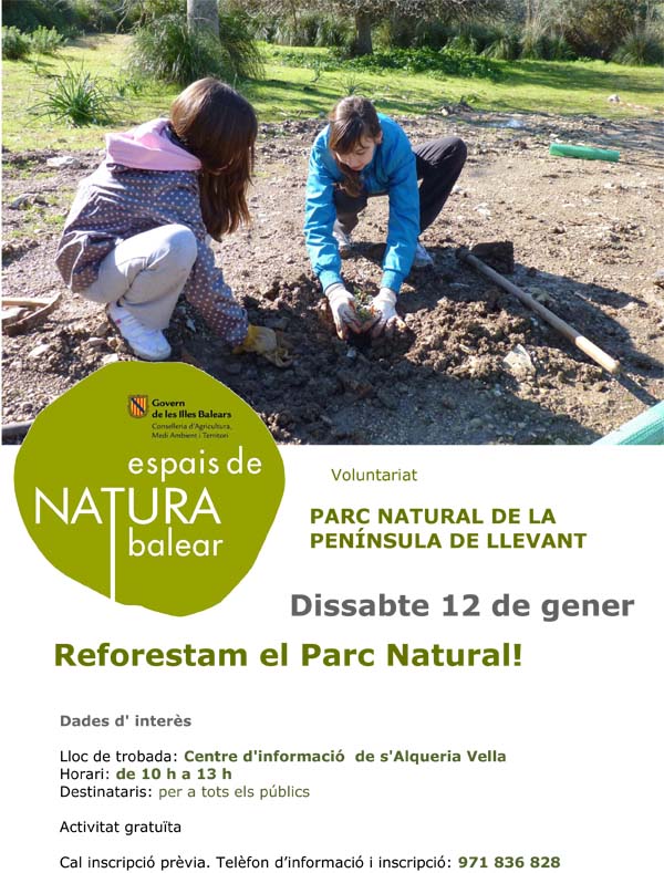Com a primera activitat d’enguany us proposam participar en una jornada de reforestació a s’Alqueria Vella el proper dissabte 12 de gener. És una activitat gratuïta i esperam que sigui del vostre interès.