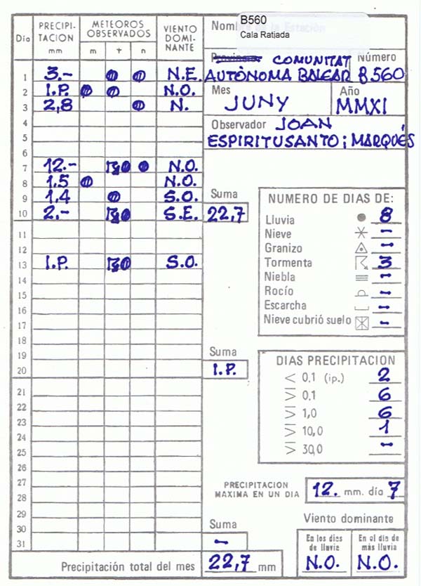 Durant aquest mes de juny les precipitacions s’han vingut concentrant durant els primers deu dies del mes, dels quals els dies 4, 5 i 6 tinguérem una treva, amb una altre incidència el dia 13 que analitzarem.