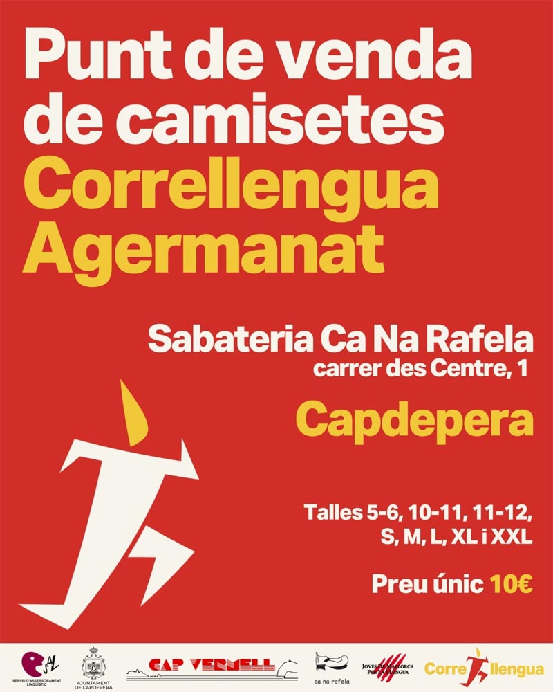 A Capdepera podeu trobar les camisetes del Correllengua Agermanat a la Sabateria Ca Na Rafela. Si vols córrer amb la flama dissabte 2 de maig pels carrers del nostre municipi contacta amb el 699 644 043. Altres articles Setmana Santa 2026 /1/ Diumenge de Rams a Capdepera i Cala Rajada 3 d'abril de 2026 “Professions estereotipades” activitat per a l’alumnat dEriçons i s’Auba 23 de març de 2026 ES PARTE 1/2026 20 de març de 2026 Activitats del Parc de Llevant / Abril 2026 28 de març de 2026 Vent i més vent 3 d'abril de 2026 El temporal de nord ha mogut bona part de l’arena de Cala Agulla 5 d'abril de 2026