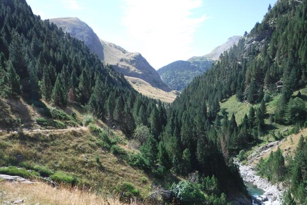 La baixada és molt llarga però més o manco suau, vorejant el riu, primer per la dreta i després per l’esquerra. Avançàvem bastant aviat, ja que el sender era de terra i no presentava gaire dificultats. Poc després d’arribar a la zona de bosc el camí es transforma en un ampli sender de terra (transitable per vehicles) que descorre a certa alçada del riu.