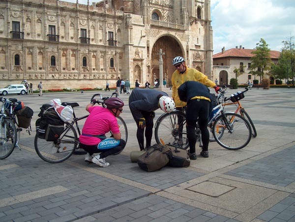 Cap a les 12’05 intentam sortir de Lleó, altra vegada, però encara som dins el casc urbà de la ciutat que ja ens tornam aturar, a berenar diuen. Em neg a menjar res, crec que a l’hora que ens trobam ja podíem haver esperat una estona més i dinar com Déu mana. Començ a sentir-me nerviós; tenc la impressió que estam perdent molt de temps inútilment. A les 12’50 ho provam una altra vegada. El temps és molt millor que ens dies precedents: està tapat però fa poc vent i la temperatura és molt més benigna. En Paco i jo insistim a anar pel camí, mentre els altres quatre tiren per la carretera. A les 15’45 som a Hospital de Orbigo, ja hem fet més de 30 km, i ens aturam a segellar les credencials i ens feim algunes fotografies. Però ningú parla de dinar, sinó que sembla haver-hi un acord tàcit per continuar fins a Astorga.