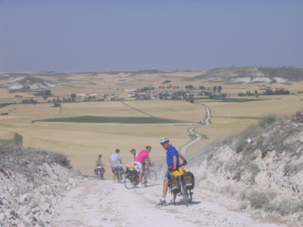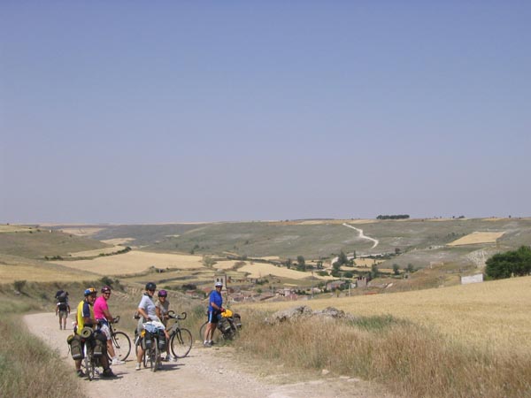 Seguint pel camí arribam a Hontanas, passat migdia, després de pujar —i davallar!— la costa de “Matamulas”, que ens ha fet més por costa avall que costa amunt. En alguns trams hem hagut de baixar de la bicicleta, perquè el camí es troba en obres i no es pot pedalar. A Hontanas refrescam i menjam una mica de fruita.