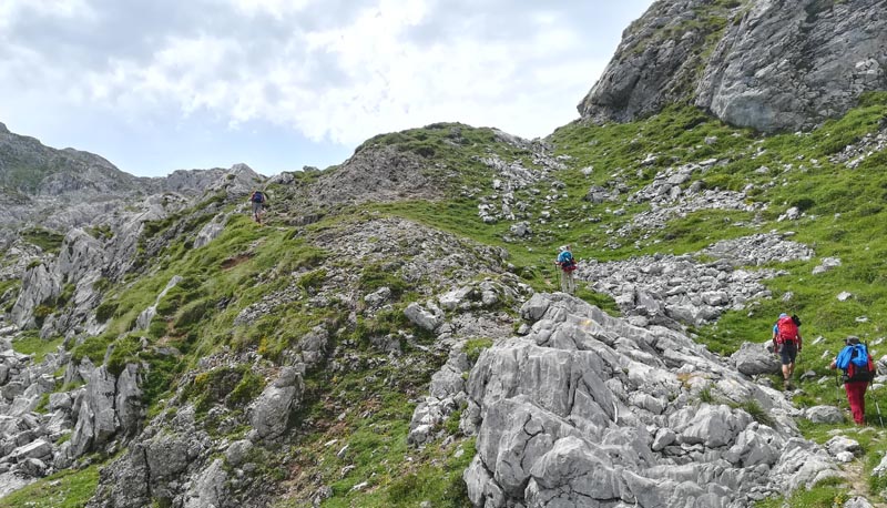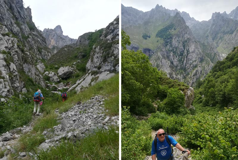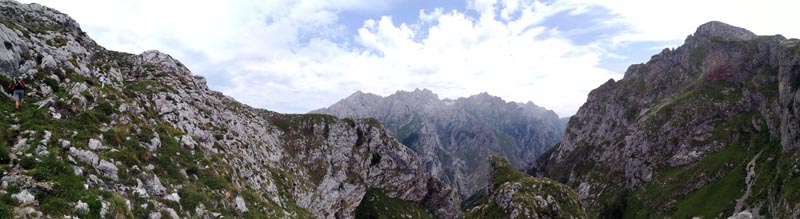 Des de la font, el camí segueix pujant entre penyals espectaculars i vistes impressionants de l’altra banda de la vall per on discorre el Cares. Mentre pujàvem el cel se tapà i amb amenaça de pluja ( i tempesta) assolírem el coll de Cruces, la sortida del canal de Treyo.