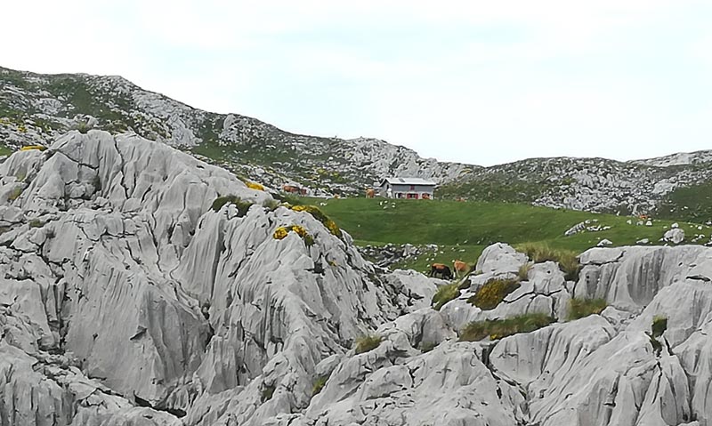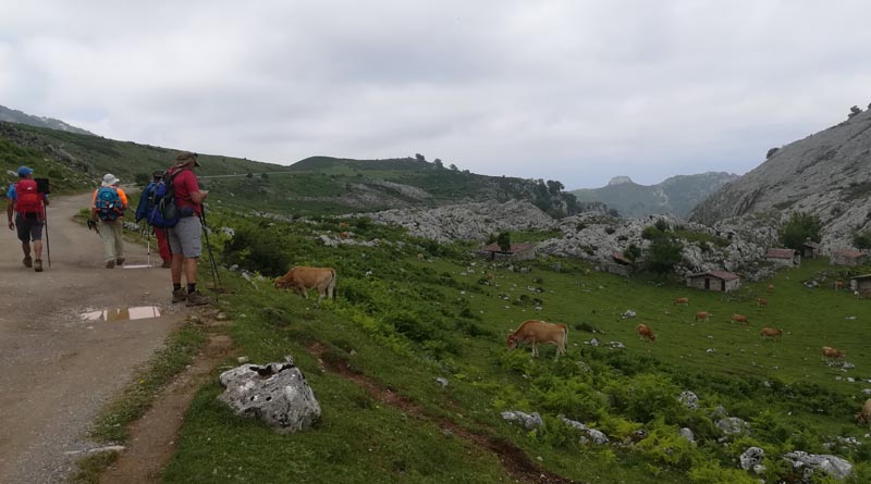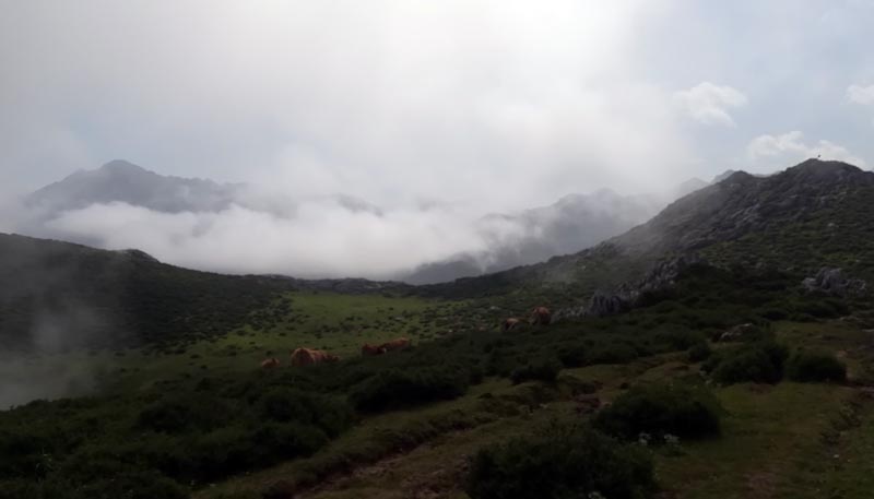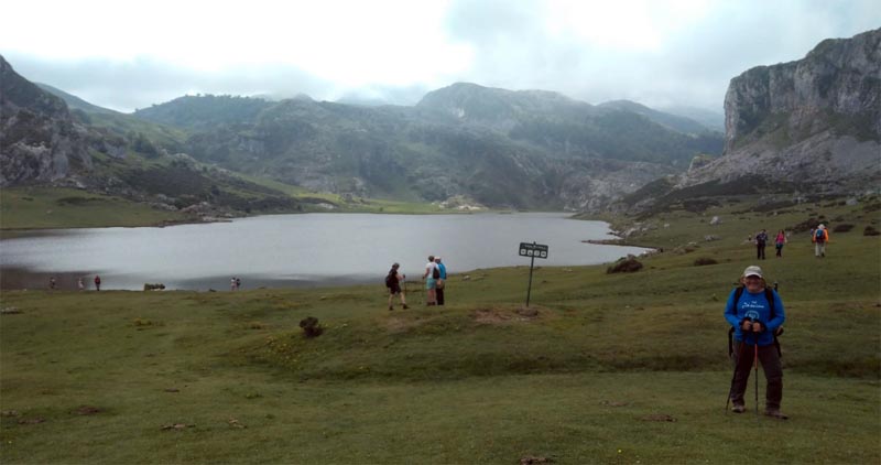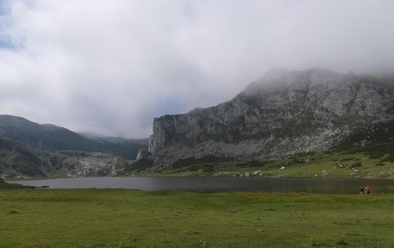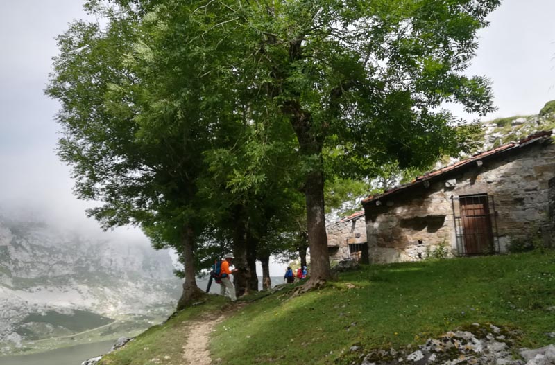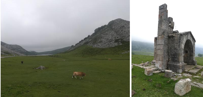 El camí, ben senyalitzat, ens dugué al refugi del llac Enol, on reservàrem habitació en el refugi per l’endemà. Just davant del refugi hi ha una capella amb la torre destrossada per un llamp caigut el dia anterior. El dia esta emboirat i no se veien les muntanyes dels voltants. Els prats eren plens de vaques.