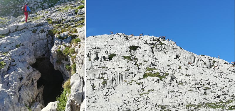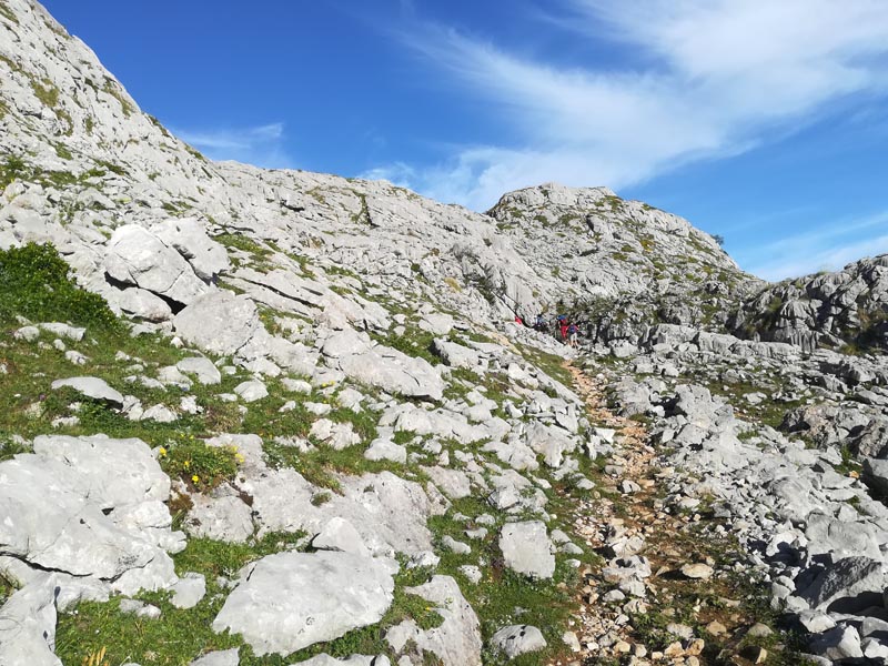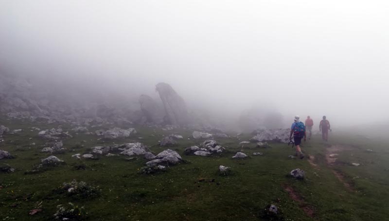 De bon matí, tornem a tenir previsió de pluja per l’horabaixa, iniciàrem la pujada cap el mirador de Cotalba. Primer per un sender pedregós ascendent típic terreny calcàri (sembla que som a Mallorca), travessant una zona càrstica caòtica, fins arribar als prats de muntanya prop dels cims on se troba el refugi lliure d’Ordiales.