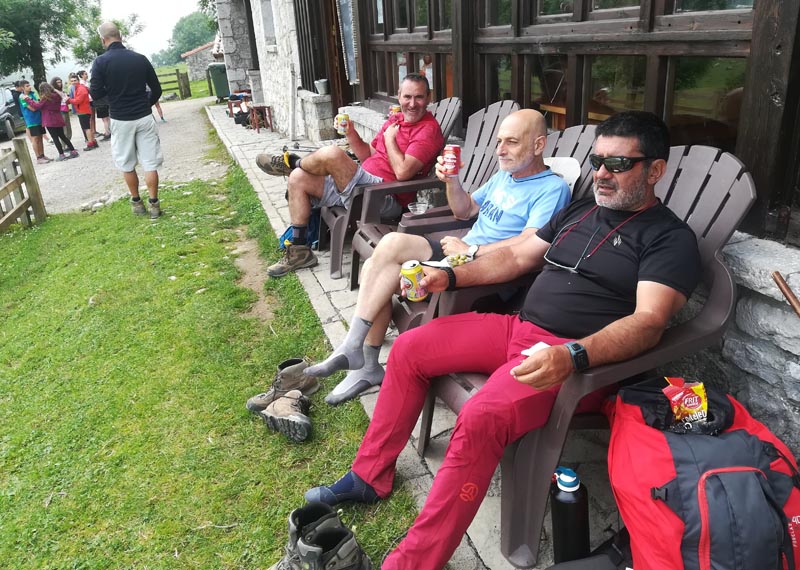 Descansats i sense frissar iniciàrem la baixada cap el refugi del llac Enol, desfent el camí que havien transitat el dia anterior. A les 16,30 eren al refugi (per cert era ple, tanta sort que havíem reservat el dia anterior!) però no podíem entrar a les habitacions… així que ens tombàrem a unes butaques a prendre la boira (estava ben tapat), férem un sidra i jugarem a les cartes mentre esperàvem per les habitacions i les dutxes. Tot quedà compensat per un bon sopar i una agradosa conversa de sobretaula amb unes senderistes basques que, com nosaltres, tenen el costum de fer una sortida anual d’un parell de dies per la muntanya. Després resultà que vam compartir habitació.