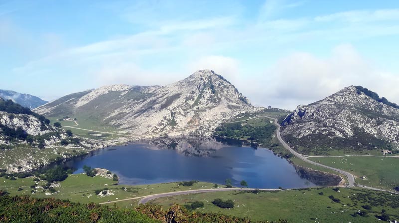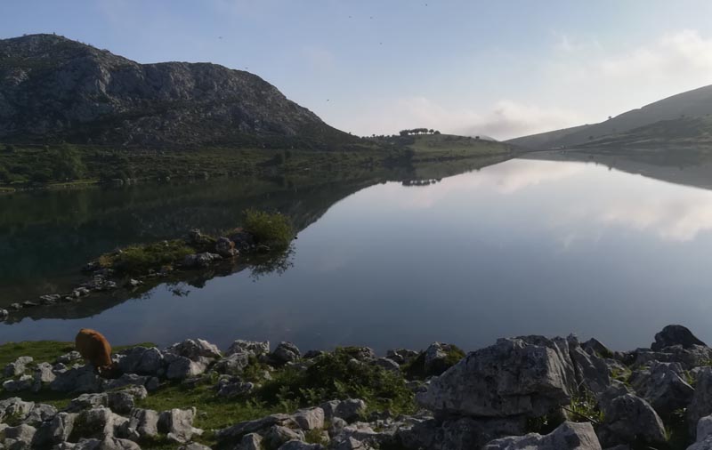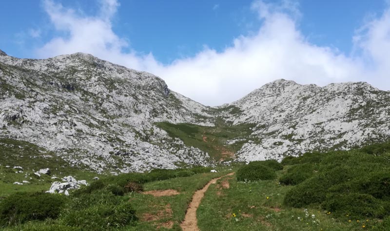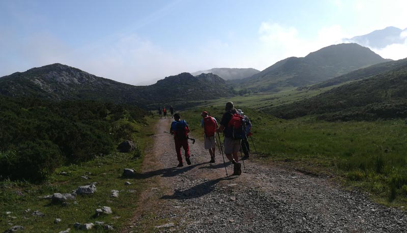 Com no frissàvem, el desjuni va ser una mica més tard i s’allargà un poc. Així i tot a els 9 ja caminàvem per la vorera del llac Enol cap el llac Ercina per la zona anomenada “entrellacs”. Un tram fàcil i còmode per una pendent suau d’herba fins arribar a un camí ample empedrat que du a un coll entre els dos llacs. Des del coll hi les vistes són molt boniques. Encara n’hi ha poca gent així que podem gaudir de l’espai sense aglomeracions humanes.