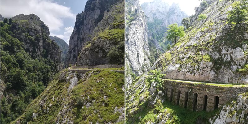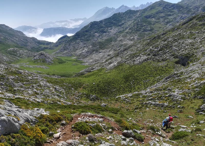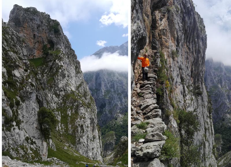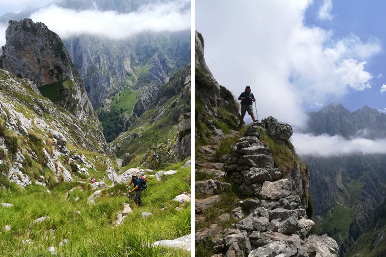Travessada la vall longitudinalment començàrem una llarga baixada cap el camí del Cares pel Costón i el canal de Culiembro. Des de dalt la baixada impressiona. Tot d’una fa unes ziga-zagues amb molta pendent que ens fan baixar ràpidament, posant a prova els genolls. El sender és estret però està ben marcat amb zones amb graons de pedra i petits marges de contenció.