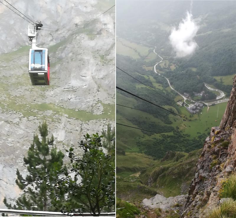 Un company decidí quedar (no volia forçar el seu genoll operat) i la resta prenguérem el telefèric amb poca gana, de fet a la coa ens banyàvem (mira que no tenir aixopluc!). La pujada pel “Cable” és espectacular malgrat el mal temps. El telefèric salva 753 metres de desnivell, fins arribar als 1823 metres, en 4 minuts. Al Gran Mirador plovia i la boira ens tapava la vista de la vall. Així i tot, tapadets i amb paraigües iniciaren la ruta PR24 des del Cable a Fuente De de 14,5 quilòmetres. Es tracta d’una baixada fàcil per una pista ample i vistes molt boniques.