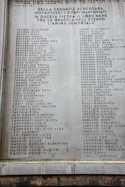 A via Mazzini, a la sinagoga, hi ha una làpida amb un nom equivocat, el de Geo Josz, únic supervivent dels 183 jueus ferrarencs deportats als camps d’extermini alemanys. Seguint per via Saraceno i Praisolo arribam a via Campofranco, on Geo Josz és propietari d’un edifici que ocupa bona part del carrer i que serví primer de quarter i presó als Brigades Negres i, quan la seva tornada a Ferrara, complia la mateixa funció a l’Associació Nacional de Partisans Italians.