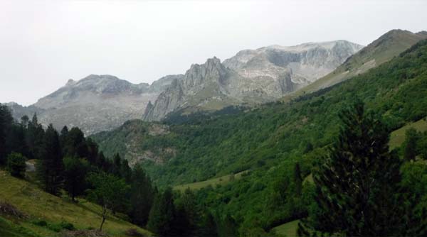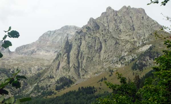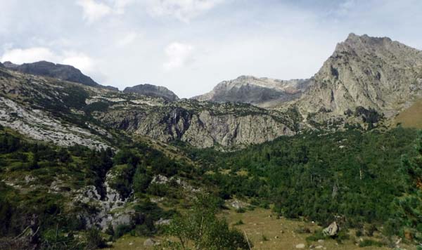 A les 6,15 ja fèiem l’esmorzar. Les perspectives climatològiques no eren bones ( pluges generalitzades), però de bon matí sembla que malgrat els núvols, la pluja no era imminent. Així que sense perdre temps i motxilles lleugeres començàrem la baixada cap a la cabana d’El Tormo, desfent part del camí que havíem fet el dia anterior. Arribats a la cabana, ja se saps que per baixar tots els sants ajuden, ens desviàrem cap a l’esquerra tot seguint la indicació que marcava 5’30 hores, travessàrem el riu i per un sender arribàrem a les quatre cases de Bartalet. Seguint la praderia trobàrem un altre indicador de 5’30 hores que ens convida a deixar el sender i enfilar una feixuga pujada pel bosc. Trobàrem algunes fites que confirmàvem l’itinerari. La pujada la trobàrem dura i ens obligà a fer aturades i mantenir un ritme lent. Tot temps vorejàvem el barranc del Perdiguero, però a una certa alçada.