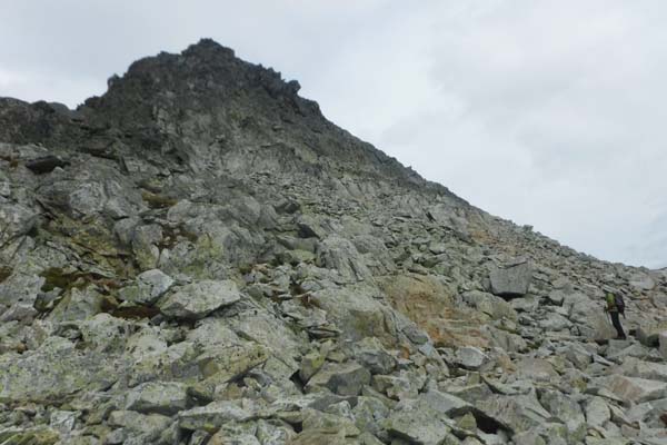 Així com poguérem, seguint una fita aquí i altra allà, arribàrem a la cresta. Alhora el temps s’embrutà, feia vent i a estones plovia. A dalt a penes guaitàrem un poc al voltant, a sota l’Ibon Blanc de Lliterola apareixia i desapareixia entre els núvols, i ben abrigadets (la temperatura baixà de cop , amb el vent i el plugim) iniciàrem la baixada.