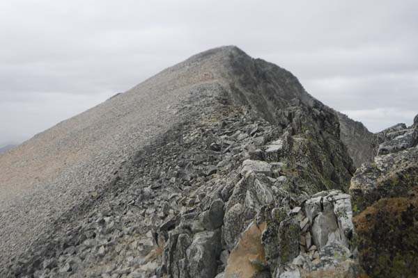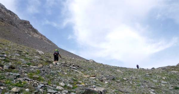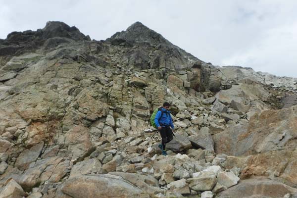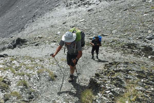Seguírem vorejant el cingle fins arribar a coll de l’Ubago, seguint unes fites que es duien cap a la vessant nord. La vista del camí que ens manca resultà desolador: un caos de blocs de pedra que se perd fins el cim, el nostre horitzó.