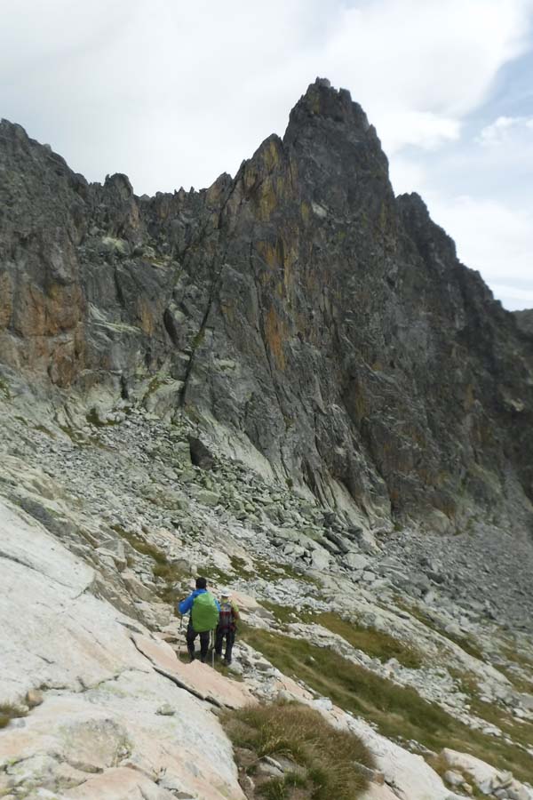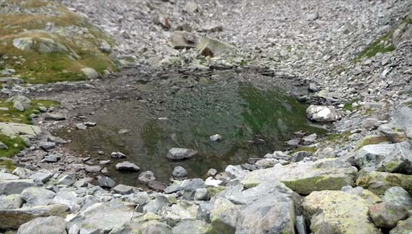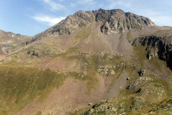 Passada la plana començarem la pujada per una rosseguera molt empinada. Hi havia fites per tot i ens arribàrem a embullar, així que enfilàrem per allà on trobàrem més lògic. Guaitàrem a veure l’Ibonet del Perdiguero, però a penes era un bassiot. Seguírem pujant la rosseguera fins arribar a la base d’una gran cingle, del Perdigueret. Des d’aquí l’abans imponent tuca Gargallosa queda a sota, com un turonet, indicant el desnivell pujat.