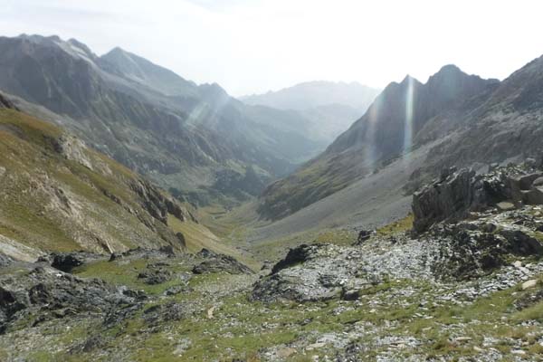 Des del refugi d’Estós el camí puja a la vorera dreta del riu Estós pel GR11 fins arribar al Port de Chistau o Collado d’Estós. D’entrada la pujada és suau per la part dreta de la vall. Quan dúiem gairebé una hora de camí ens aturàrem a descansar i fer volar el dron. Així aprofitàrem per veure la vall i les muntanyes que la voregen, algunes encara en ombra: la Tuqueta de Paüls, Les Agulles, la Tuca de Paül o Punta Chistau.