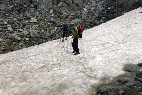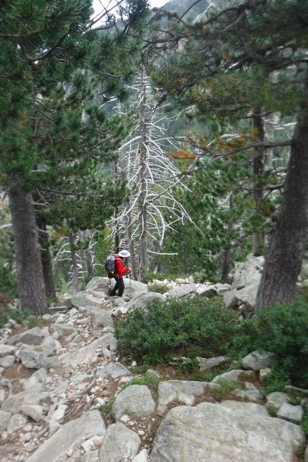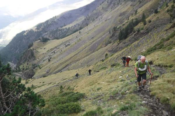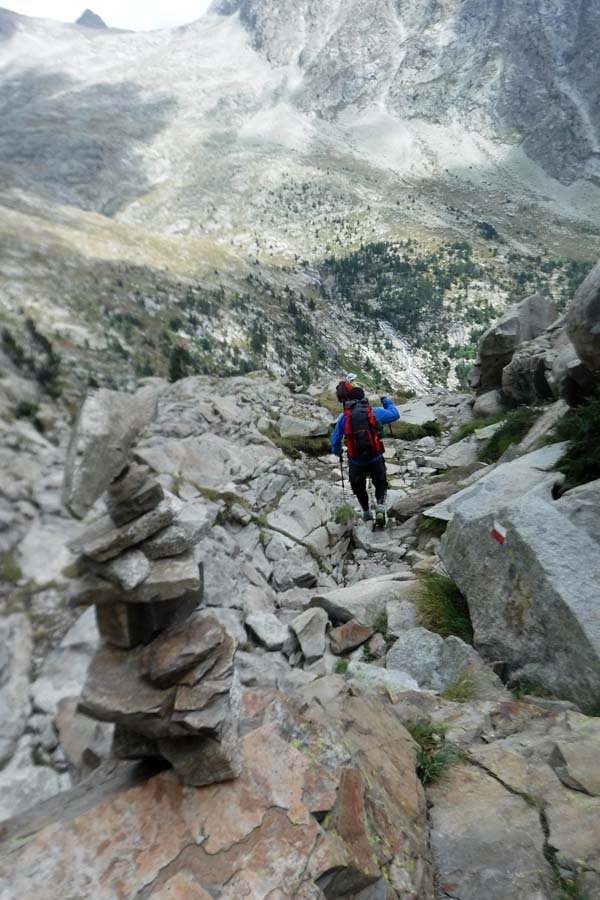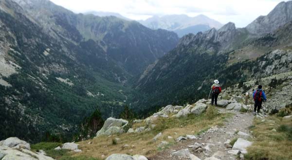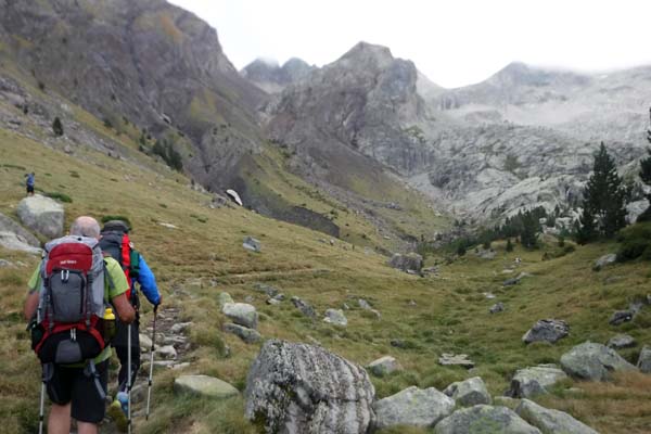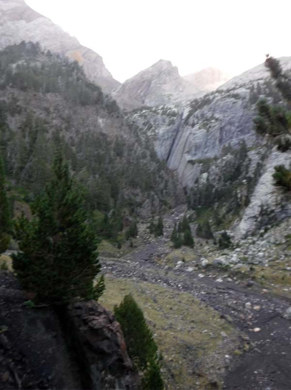 A les 6,30 ens aixecàrem, esmorzàrem i preparàrem les motxilles. A fora plovisquejava. Toni decideix baixar cap a Benasque amb els catalans, i Joan i Paco ens arriscàrem (per la pluja) a acabar la volta. La parella que coneguérem al sopar ens anima a fer aquest tram, per a ells és el més bonic. Les 7,45 sortíem i desfèiem el tram (ara de pujada) fins el creuer cap a Estós. Ho férem aviat.