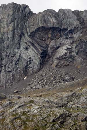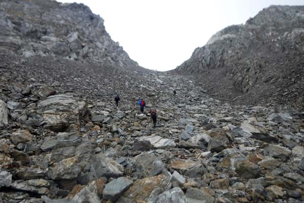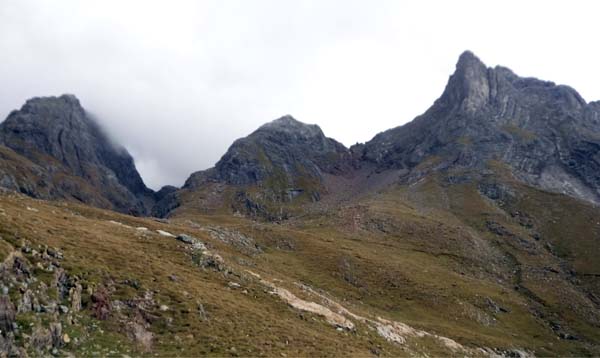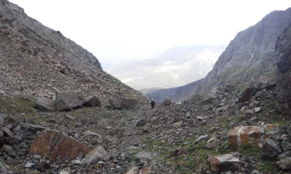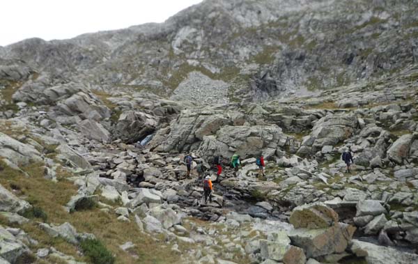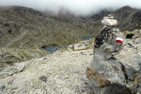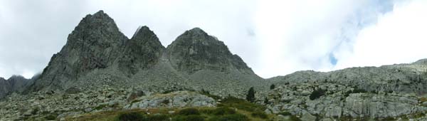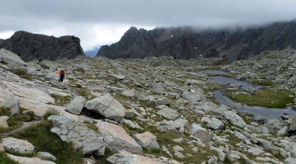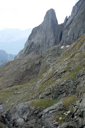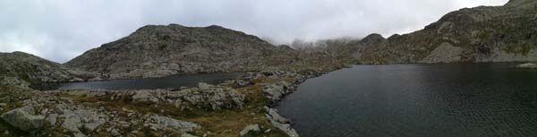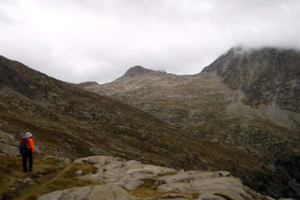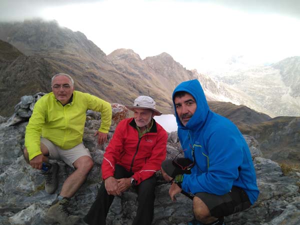 Arribàrem a un primer circ, i passada la desviació a l’Ibón de Millars (que havíem d’obviar) comença una primera pujada forta que ens deixà sense alè. Pensàvem que érem a un coll, però no, de fet arribàrem a una altre circ envoltat de muntanyes i núvols. Feia fred i la boira baixava i pujava a estones, impedint veure els cims. Així tot aturàrem cinc minuts, el just per menjar una mica i beure. Parlàrem amb un grup de catalans i francesos amb els que hem arribat a tenir certa familiaritat ja que hem coincidit al refugi.