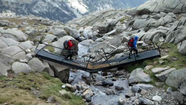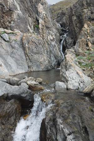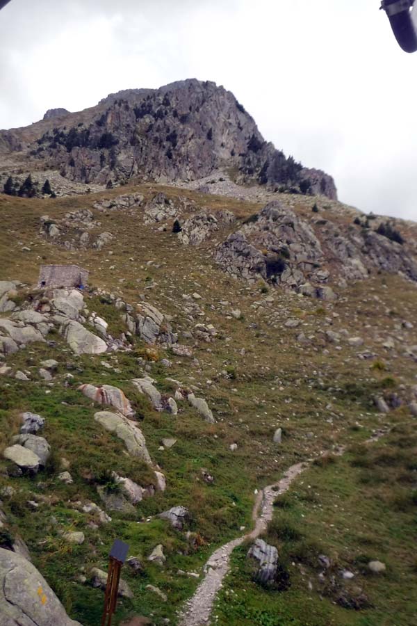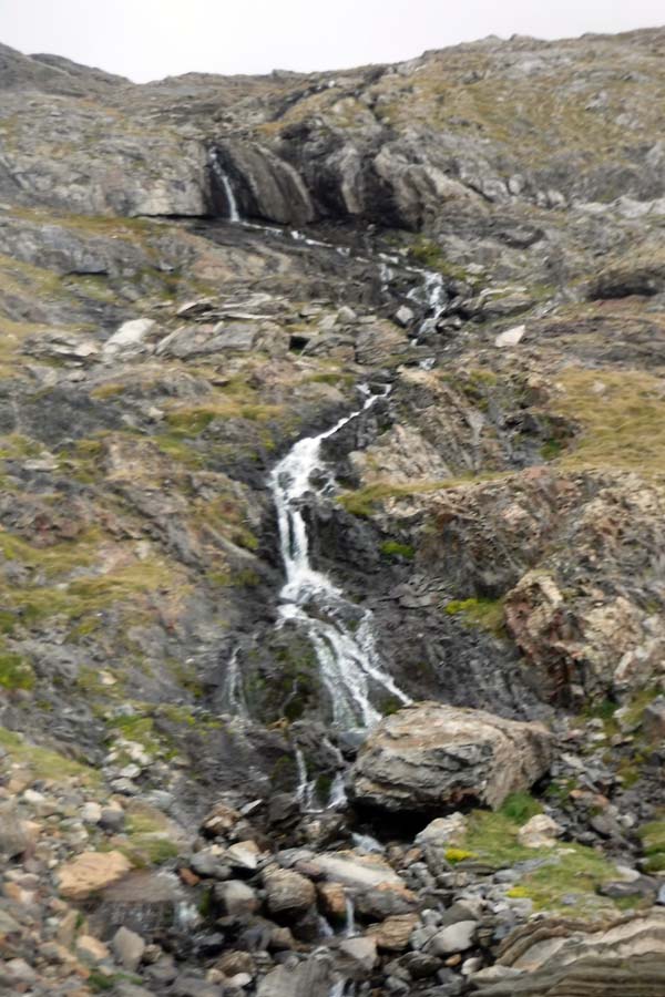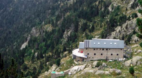 Des d’aquí, la baixada fins el refugi d’Angel Arús passa per una zona granítica molt bonica, amb vistes als salts d’aigua del barranc dels Ibons. Trobàrem el creuer del camí cap a Estós (que hem de fer l’endemà). En tres quarts d’hora de baixada érem al refugi, que més aviat sembla un hotel, això sí “una mica deixat”. Arribats i acomodats férem la rutina de cada dia. A fora feia fred i plovia. Aprofitàrem que hi havia cobertura pel mòbil.