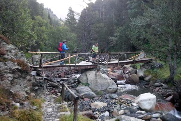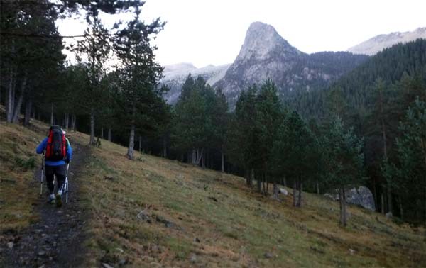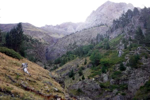 A les 7,30 ja érem a punt per partir, amb vol de dron per la vall inclòs. Ens tocava una etapa “durilla”, però també molt maca. Desférem un bocí de camí fins el riu, que travessàrem per un pontet. D’aquí surt el camí directe al Llardana/Possets, que deixàrem a l’esquerra. Nosaltres seguírem vora el riu una estona per un sender senyalitzat, que puja suaument pel bosc. Érem a la zona de les Espases.