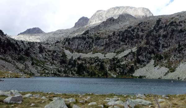 Després d’una baixada molt pronunciada que supera un ressalt rocallós, vorera uns blocs de granit impressionants, arribàrem a l’Ibón de Batisiells. Feia vent i cercàrem una mica de redossa en una gran pedra per dinar.