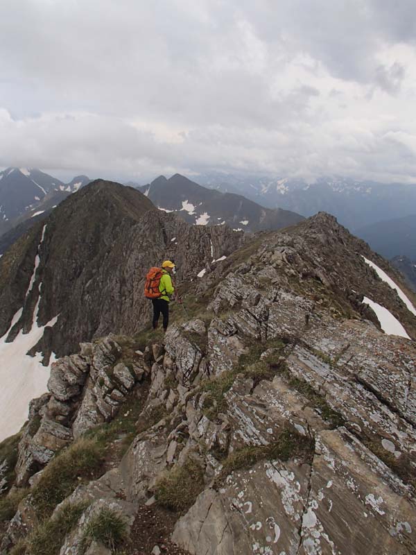 En arribar a dalt ens adonàrem que era molt tard i feia fresca, així que deixàrem els pocs metres que ens faltàvem fins el cim i anàrem a cercar els companys. La travessa per la carena estava senyalitzada amb fites i de tant en tant seguíem un caminoi moltes vegades tallat per clapes de neu.
