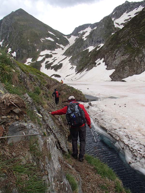 Seguírem tots quatre vorejant el vessant nord-est del Tuc Blanc, amb forts pendents i glaceres, però el camí no perdé alçada i es trobava molt ben indicat. Al fons vèiem el port de Barlonguèra, el nostre objectiu, definit pel Tuc Blanc i el Tuc de Meisha.