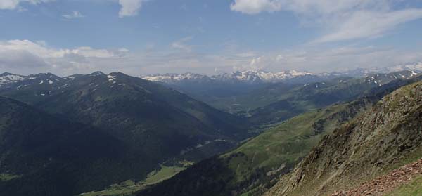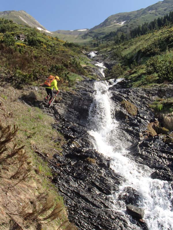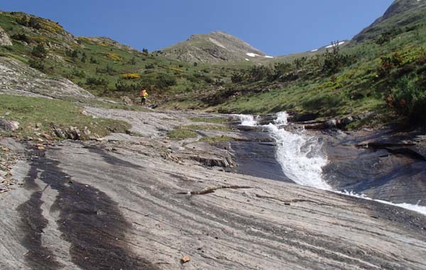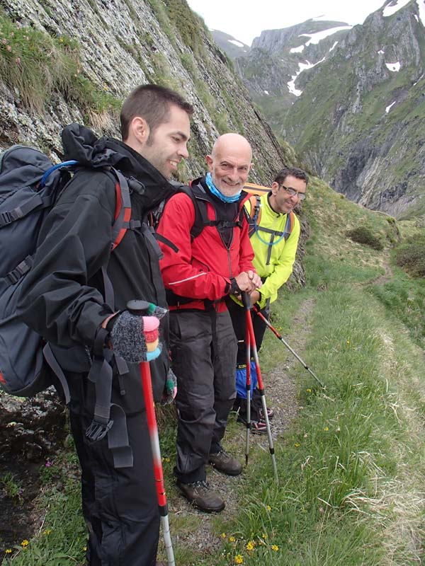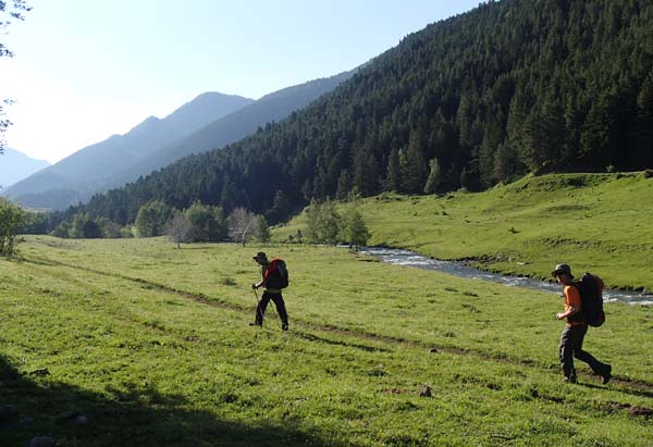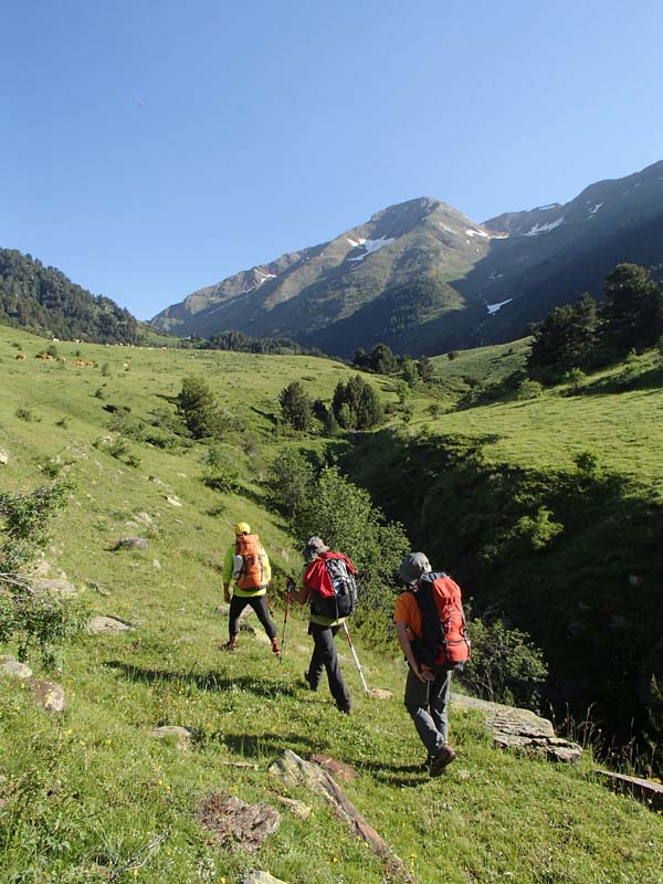 Aquesta primera etapa resultà prou exigent i ens permeté descobrir la zona del massís del mont Valiér. Nosaltres ens despertàrem a les 7 del matí i després d’un bon desdejuni tipus bufet, amb musica ambiental de “Triana”, començàrem a caminar per un sender que surt just darrere l’església de Montgarri i puja suaument en direcció est. Seguírem, com poguérem, les senyals del GR trans-fronterier, color groc. Aquest tram no estava massa ben senyalitzat (o nosaltres encara estàvem mig adormits), però l’itinerari es feia evident. Vorejàrem un torrent (l’Arriu Porquèr) que baixava de la zona de Barlonguèra, i devers les 9,30, en el coll de la Solana, ens separàrem. En Joan i en Tomeu seguirien per la ruta diguem-ne “normal”, cap al port de la Giretta, on ens esperarien.
