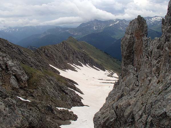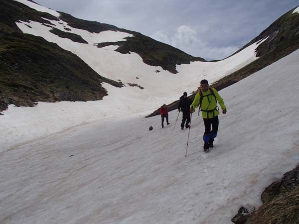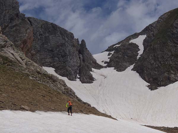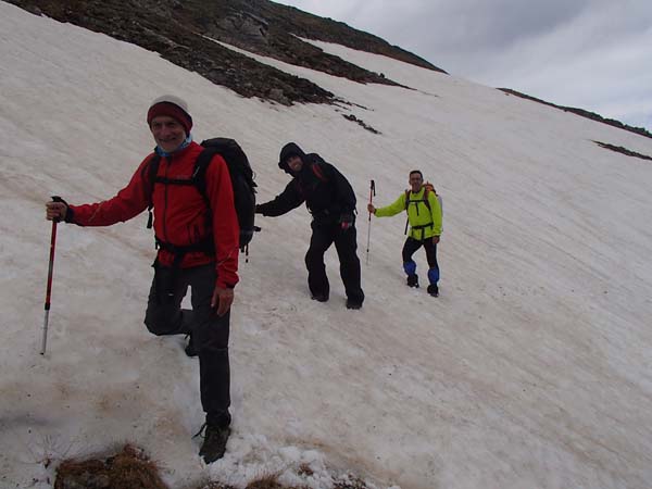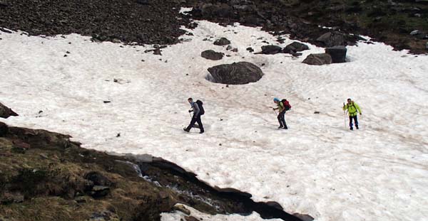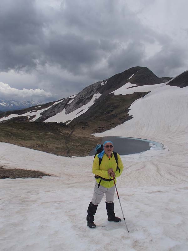Avançàrem amb certa rapidesa i aviat fórem a prop del pic de la Giretta. Des de dalt vérem dues persones assegudes i pensàrem que eren el nostres companys. Cametes me valguin! Baixàrem gairebé corrensos pels prats i…, oh sorpresa!, no eren en Joan i en Tomeu, sinó tres francesos. No havíem arribat al port de la Giretta sinó al Clot de Renhaja (2442 m), que era ben ple de neu. Férem una mossegada ràpida i seguint el camí (prou senyalitzat, malgrat la neu), en poc temps arribàrem on havíem quedat. Realment pensàvem que no ens esperarien (feia fred i amenaçava pluja), però eren allà, refugiats sota un plàstic. Havíem arribat dues hores més tard del previst. Fora dir res decidírem no tornar separar-nos, ni fer rutes “alternatives”. Estàvem a 2.503 m.