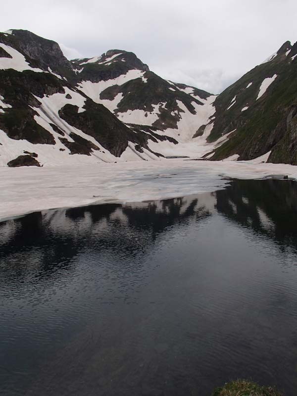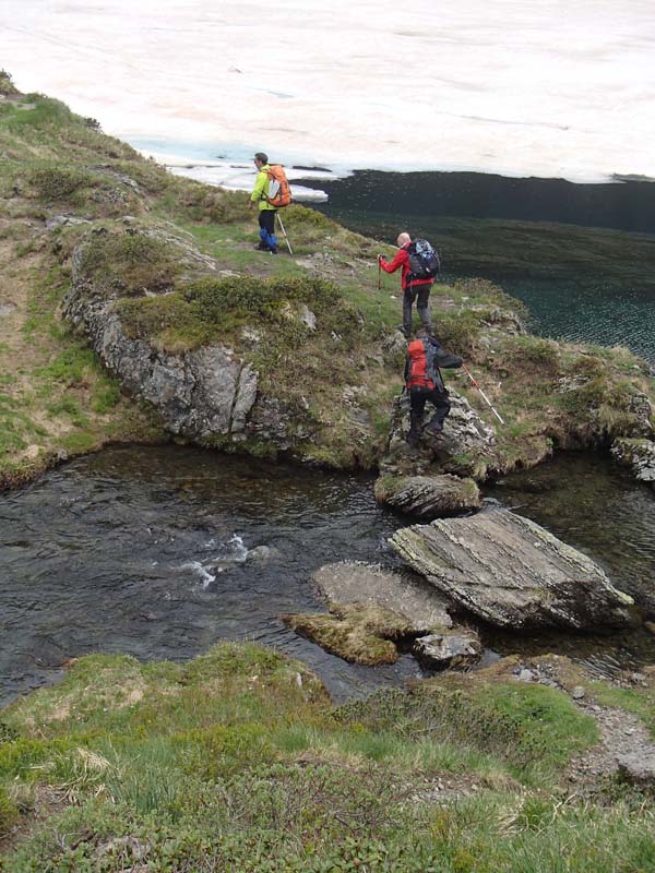 En arribar al llac vàrem comprovar que el camí el vorejava ben arran de l’aigua, semblava que no podríem passar. En alguns punts trobàrem passamans de seguretat. El llac es trobava mig congelat, ple de bocins de gel, la qual cosa feia que presentàs uns tons de blau molt bonics.