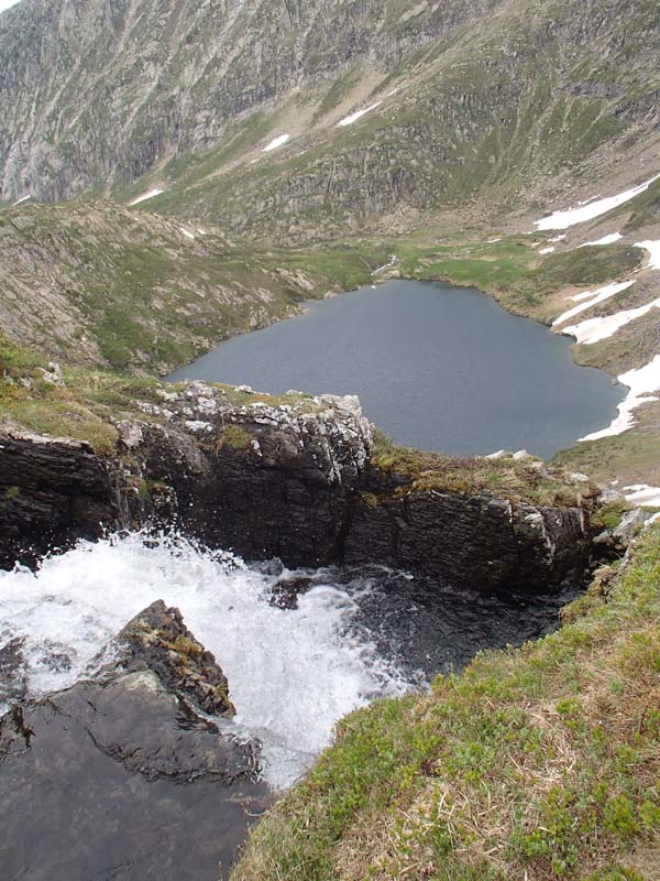 A l’extrem de llac Long hi ha un bot d’aigua impressionant que enllaça aquesta massa d’aigua amb un altre llac situat a la part inferior, el llac Rodon (per la forma). Travessant el corrent d’aigua i botant unes pedres, arribàrem a una mena de balcó. En aquest punt poguérem veure tot l’itinerari que ens faltava, inclús el refugi, que curiosament es trobava a la mateixa alçada d’on érem.