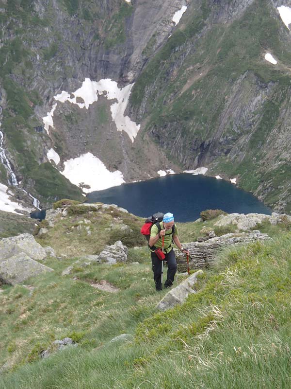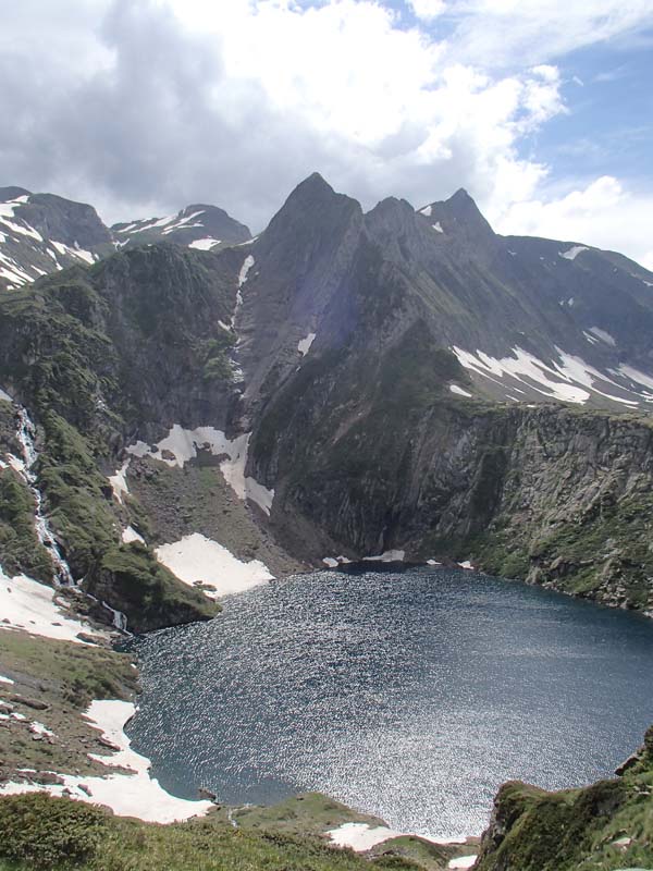 Arribats a un creuer de camins (1.935 m), teníem clar que el nostre era el que pujava, cap el refugi dels Estagnous, deixant-ne un de més evident que voreja el llac. Mentre guanyàvem alçada, la vista de l’estany resultava més impressionant, com les muntanyes que l’envolten (muntanya des Caucis, pic de Cernalles o pic Clavera).