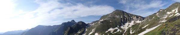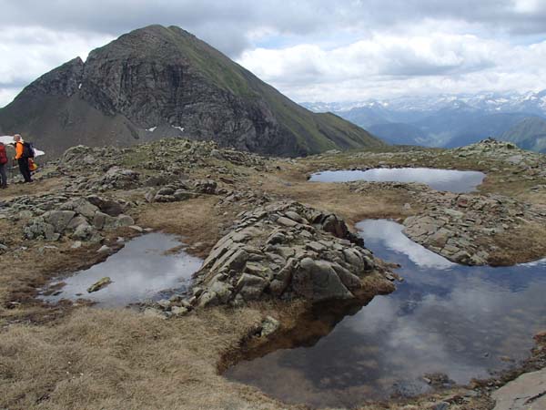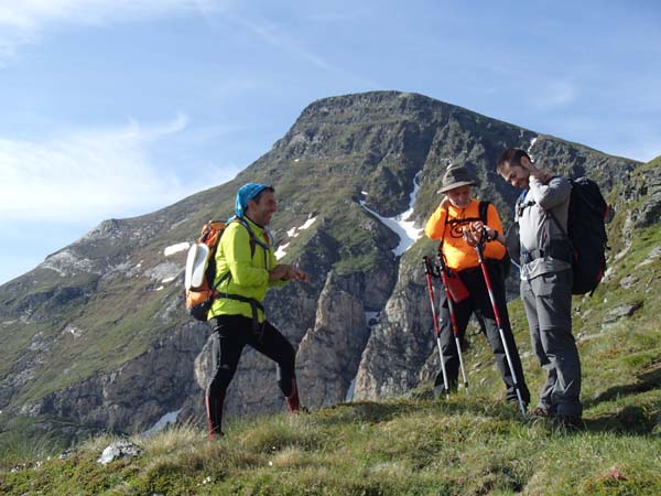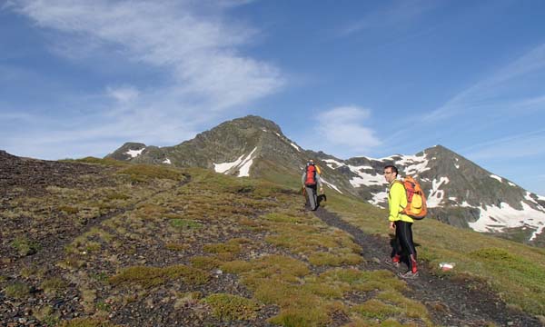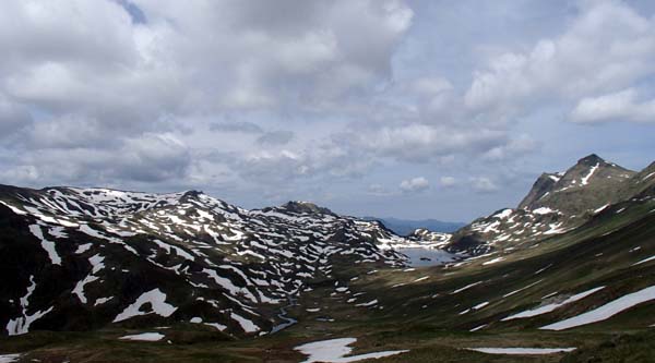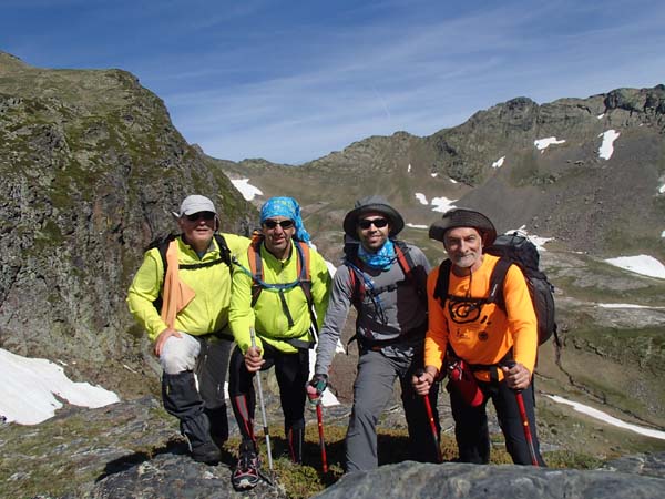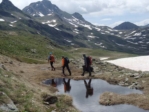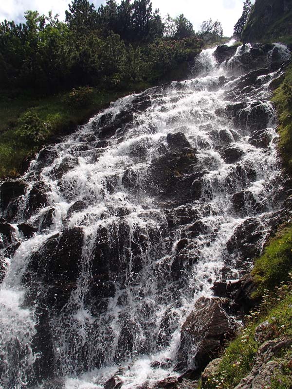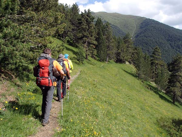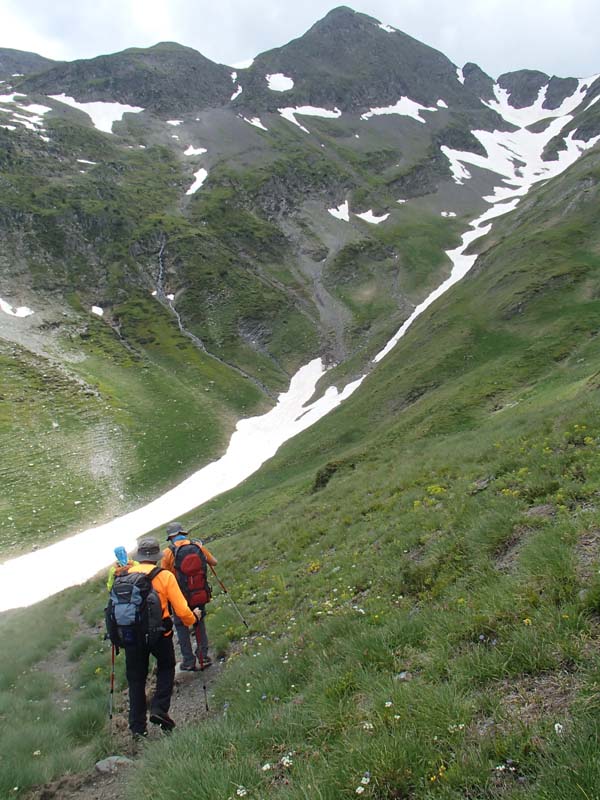 Descansats i amb la panxa plena (és un dir!), iniciàrem la pujada del coll de Montoliu (2470 m) per un camí ample. Des del coll es veia la vall que havíem de travessar, en direcció SW. El camí anava serpentejant diverses vegades. Entre praderes i tarteres, travessàrem un petit barranc pel marge esquerre i enfilàrem una llarga baixada pel vessant nord del Serrat de Cardigassos ( Bac des Cardigassos) fins arribar a l’Arriu de Vernatar (2100 m). La baixada se féu llarga, tot travessant un parell de rierols que queien en cascades de gran bellesa.